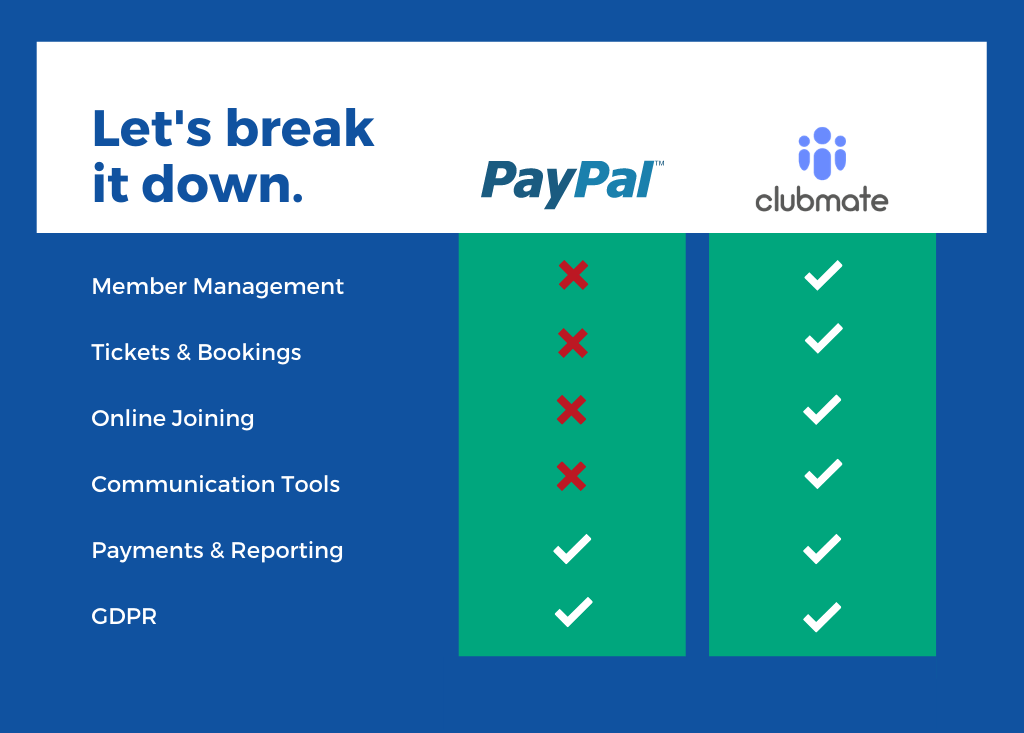 A breakdown of the main differences between Clubmate and PayPal.